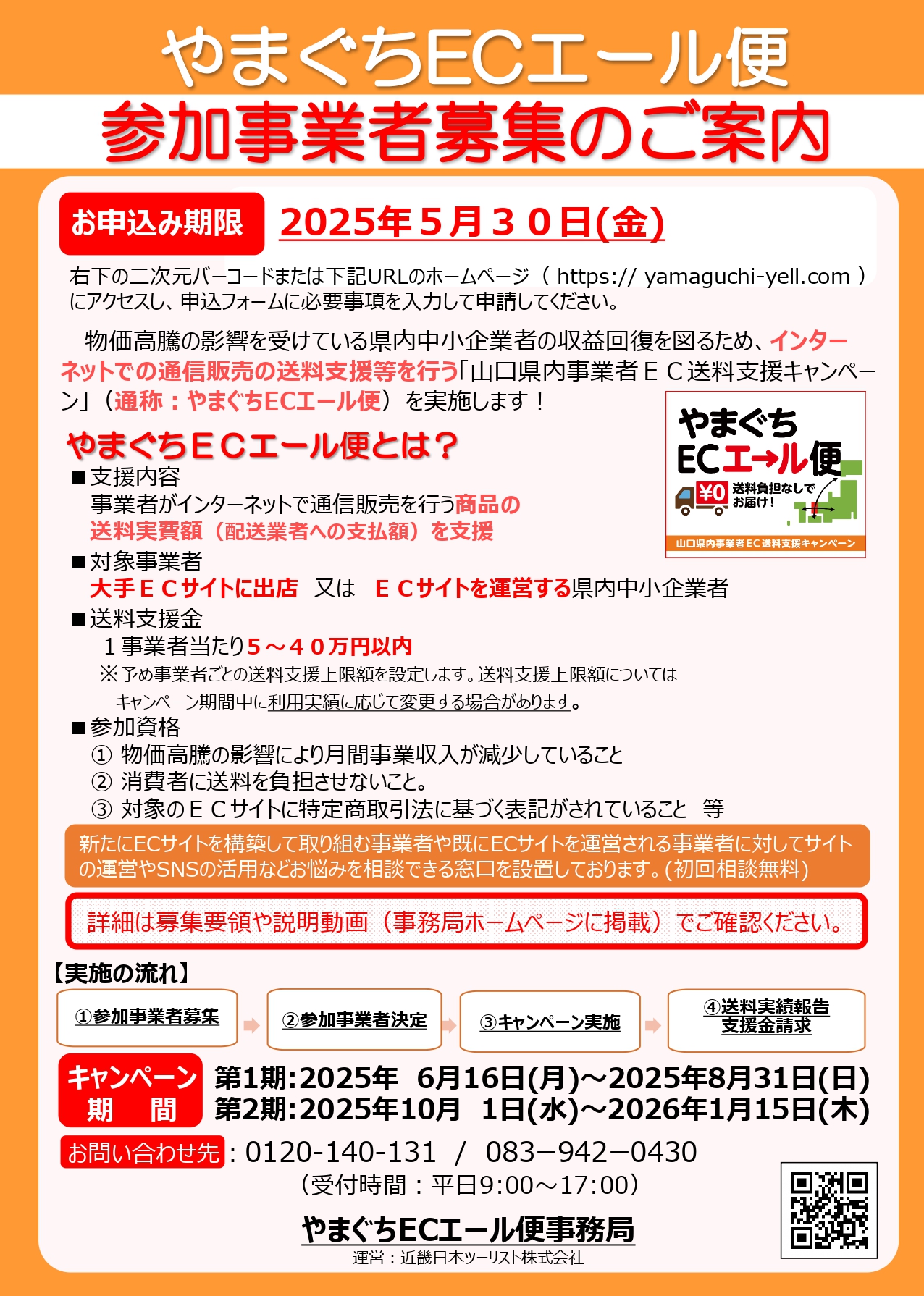 物価高騰の影響を受けている県内中小企業者の収益回復を図るため、インターネットでの通信販売の送料支援等を行う「山口県内事業者EC送料支援キャンペーン」(通称:やまぐちECエール便)を実施します。