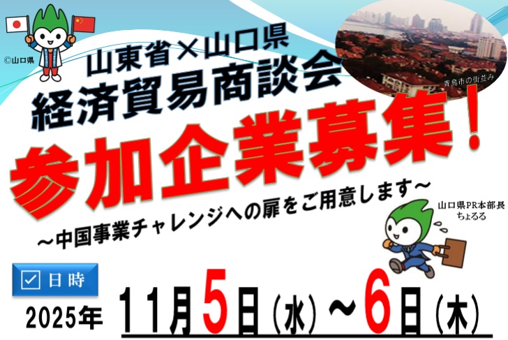 山口県企業の海外事業展開支援及び山東省企業との国際経済交流促進のため、中国山東省青島市において、山東省政府との共催により貿易商談会が開催されます。