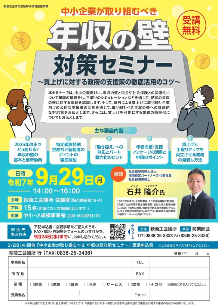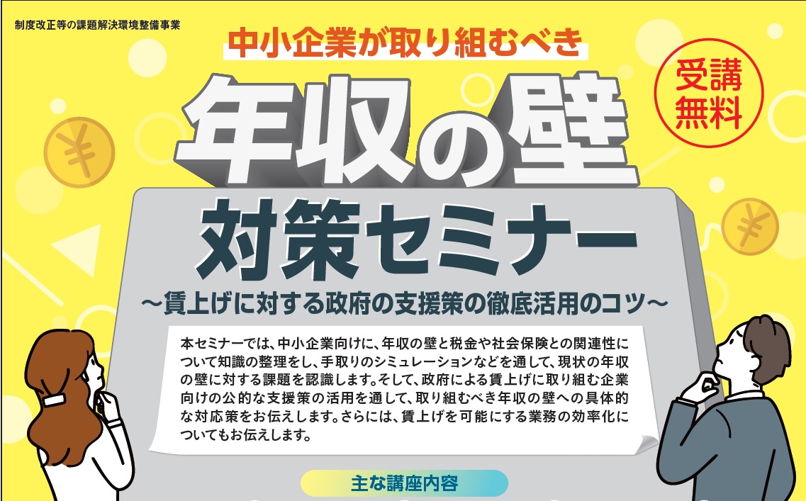 本セミナーでは、中小企業向けに、年収の壁と税金や社会保険との関連性について知識の整理をし、手取りのシミュレーションなどを通して、現状の年収の壁に対する課題を認識します。そして、政府による賃上げに取り組む企業向けの公的な支援策の活用を通して、取り組むべき年収の壁への具体的な対応策をお伝えします。さらには、賃上げを可能にする業務の効率化についてもお伝えします。