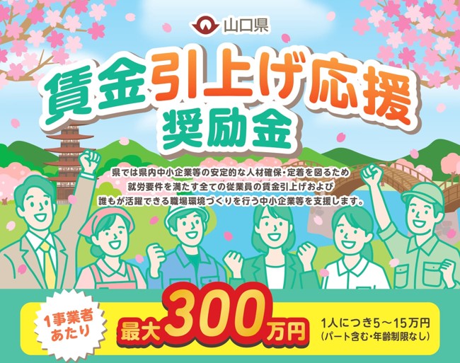 山口県では、県内中小企業等の安定的な人材確保・定着を図るため就労要件を満たす全ての従業員の賃金引上げおよび誰もが活躍できる職場環境づくりを行う中小企業等を支援します。